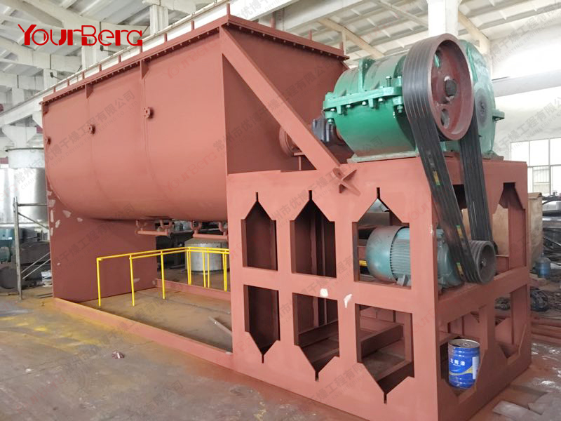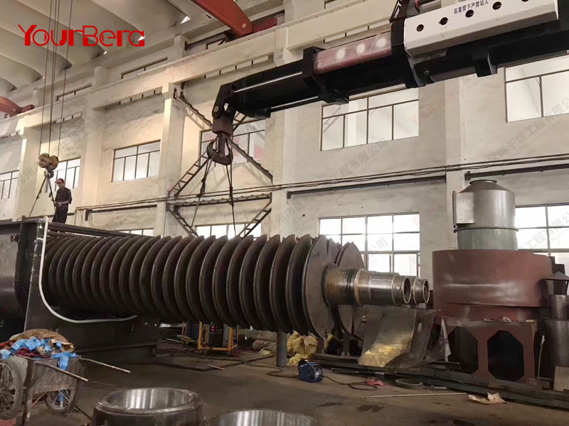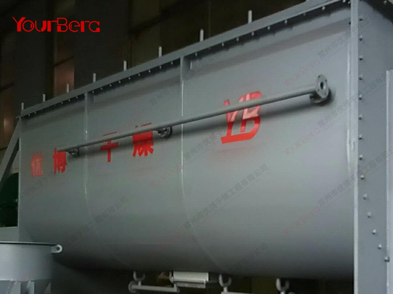 空心軸上密集排列著楔型中空漿葉,熱介質(zhì)經(jīng)空心軸流經(jīng)漿葉。單位有效容積內(nèi)傳熱面積很大,熱介質(zhì)溫度從-40℃到320℃,可以是水蒸汽,也可以是液體型:如熱水、導(dǎo)熱油等。間接傳導(dǎo)加熱,沒(méi)有攜帶空氣帶走熱量,熱量均用來(lái)加熱物料。熱量損失僅為通過(guò)器體保溫層向環(huán)境的散熱。楔型漿葉傳熱面具有自清潔功能。物料顆粒與楔型面的相對(duì)運(yùn)動(dòng)產(chǎn)生洗刷作用,能夠洗刷掉楔型面上附著物料,使運(yùn)轉(zhuǎn)中一直保持著清潔的傳熱面。漿葉干燥機(jī)的殼體為Ω型,殼體內(nèi)一般安排二到四根空心攪拌軸。殼體有密封端蓋與上蓋,防止物料粉塵外泄而充分發(fā)揮作用。