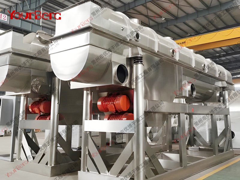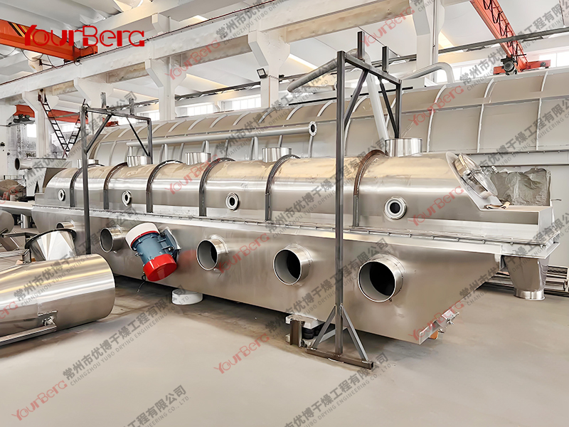 普通流化床干燥機在干燥顆粒物料時,可能會存在下述問題:(1)當顆粒粒度較小時形成溝流或死區(qū);(2)顆粒分布范圍大時夾帶會相當嚴重;(3)由于顆粒的返混,物料在機內(nèi)滯留時間不同,干燥后的顆粒含濕量不均;(4)物料濕度稍大時會產(chǎn)生團聚和結(jié)塊現(xiàn)象,而使流化惡化等。為了克服上述問題,出現(xiàn)了數(shù)種改型流化床,其中振動流化床就是一種較為成功的改型流化床干燥機。