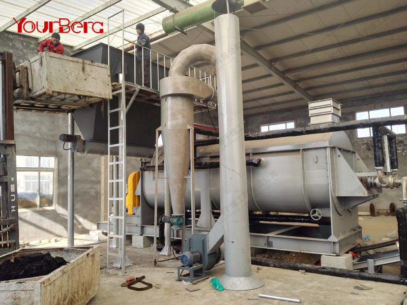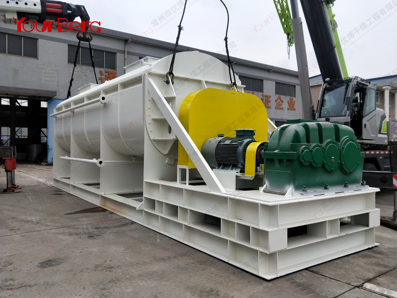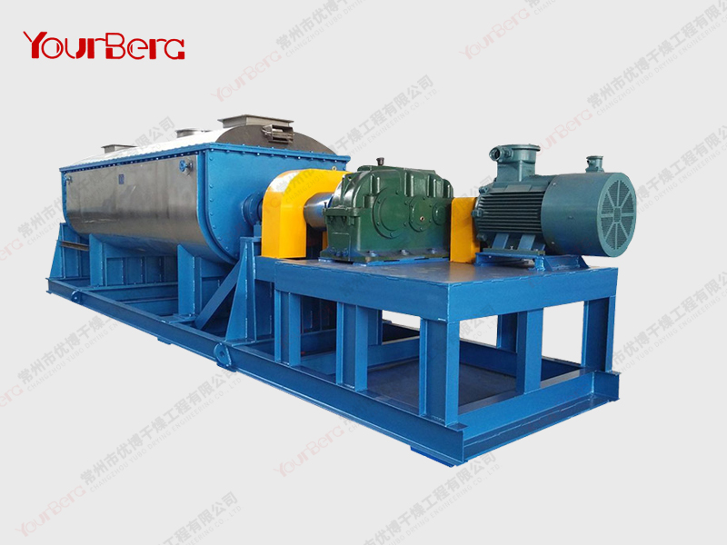 空心軸上密集排列著楔型中空漿葉,熱介質經空心軸流經漿葉。單位有效容積內傳熱面積很大,熱介質溫度從-40℃到320℃,可以是水蒸汽,也可以是液體型:如熱水、導熱油等。間接傳導加熱,沒有攜帶空氣帶走熱量,熱量均用來加熱物料。熱量損失僅為通過器體保溫層向環(huán)境的散熱。楔型漿葉傳熱面具有自清潔功能。物料顆粒與楔型面的相對運動產生洗刷作用,能夠洗刷掉楔型面上附著物料,使運轉中一直保持著清潔的傳熱面。漿葉干燥機的殼體為Ω型,殼體內一般安排二到四根空心攪拌軸。殼體有密封端蓋與上蓋,防止物料粉塵外泄而充分發(fā)揮作用。