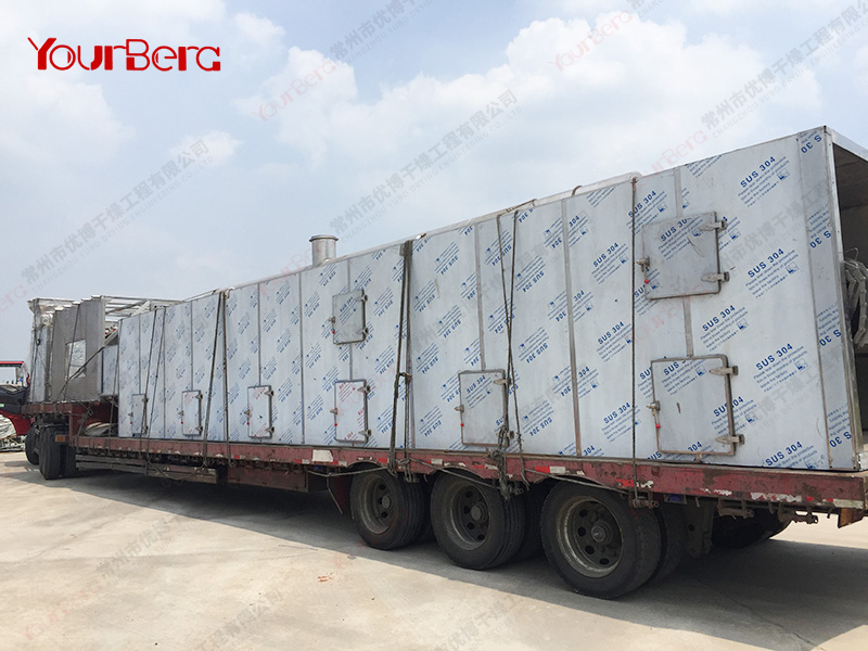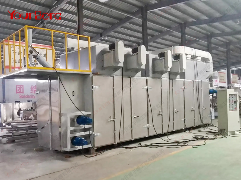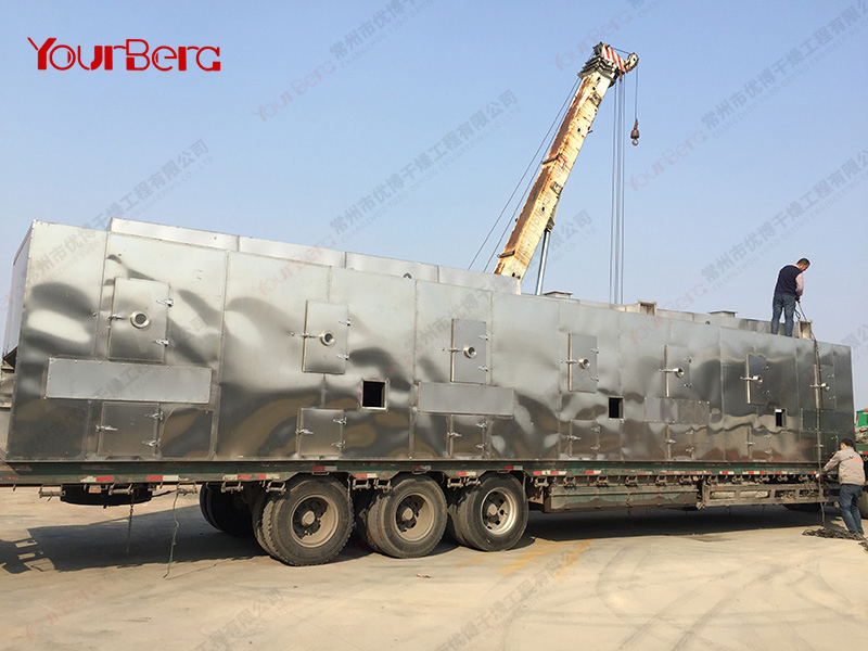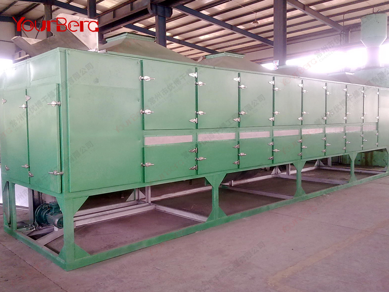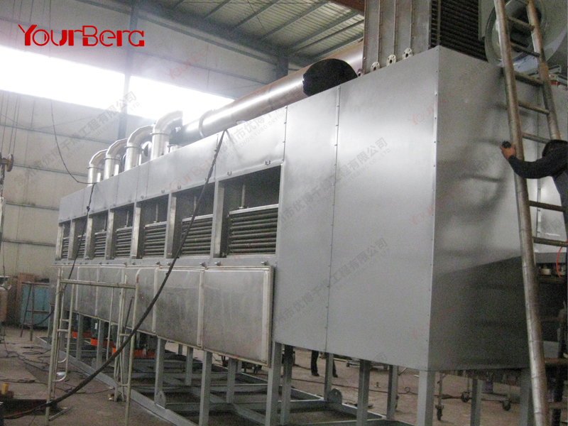 物料由加料器均勻地鋪在網(wǎng)帶上,網(wǎng)帶采用12-60目不銹鋼絲網(wǎng)。由傳動裝置拖動在干燥機內(nèi)移動。干燥機由若干單元組成,每一單元熱風(fēng)獨立循環(huán),部分尾氣由專門排濕風(fēng)機排出,廢氣由調(diào)節(jié)閥控制,熱氣由下往上或由上往下穿過鋪在網(wǎng)帶上的物料,加熱干燥并帶走水分。網(wǎng)帶緩慢移動,運行速度可根據(jù)物料溫度自由調(diào)節(jié),干燥后的成品連續(xù)落入收料器中。上下循環(huán)單元根據(jù)用戶需要可靈活配備,單元數(shù)量可根據(jù)需要選取。
