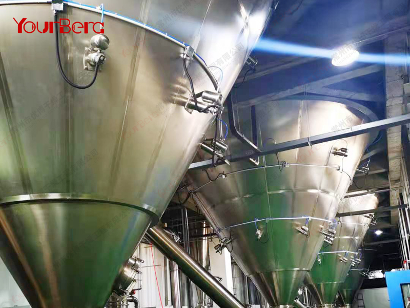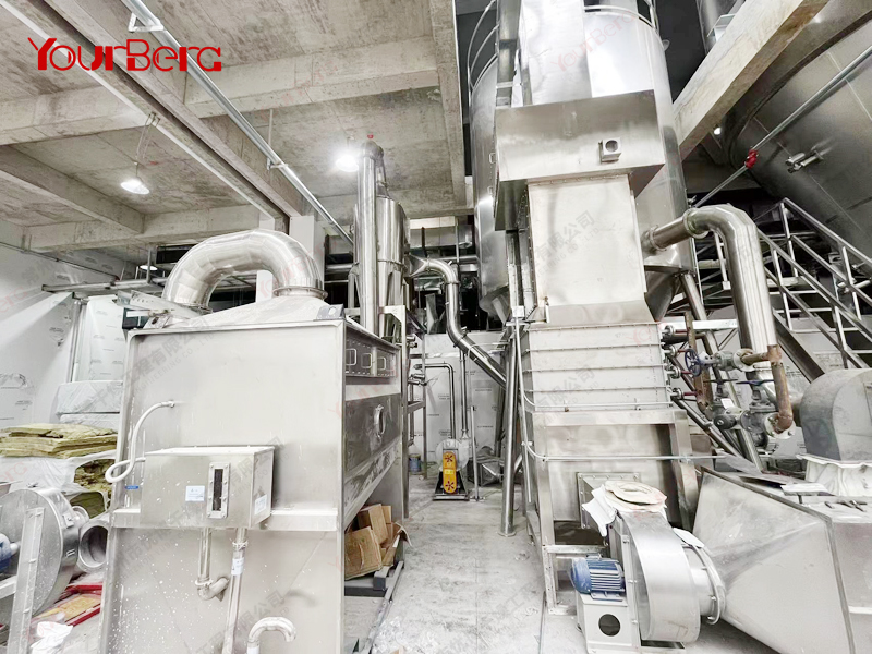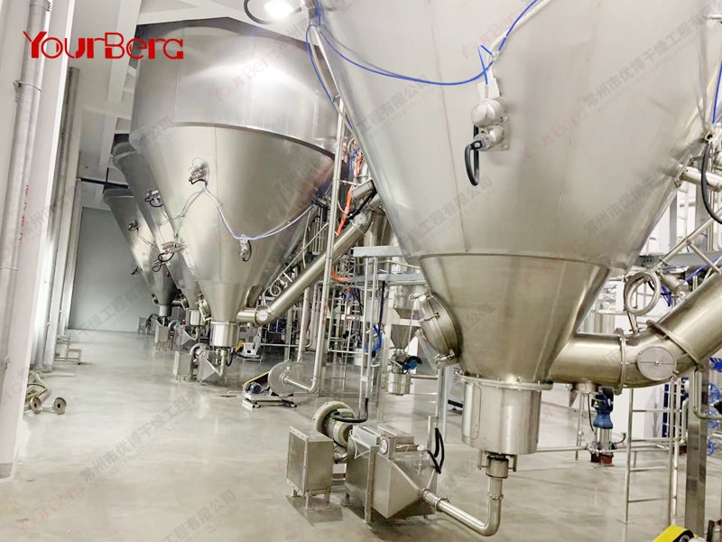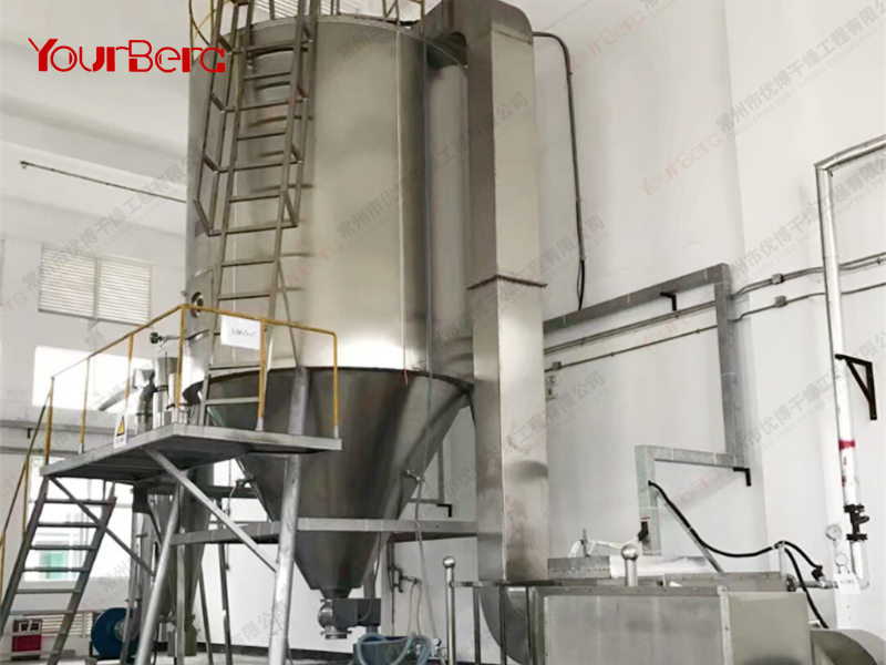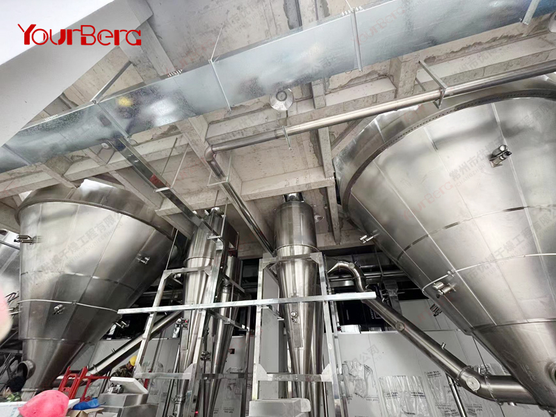空氣經(jīng)空氣過濾器后進(jìn)入空氣加熱器,當(dāng)空氣加熱器到給定的溫度后以切線方向進(jìn)入熱風(fēng)分配器,經(jīng)熱風(fēng)分配器作用后的空氣,均勻地、螺旋式地進(jìn)入干燥室,同時(shí)料液由霧化器霧化為20~60um的霧滴,當(dāng)霧滴與熱空氣接觸后就迅速汽化干燥為粉末或顆粒產(chǎn)品。采用旋風(fēng)風(fēng)離器直接收集后經(jīng)氣力輸送至效料倉,完成物料的冷卻及輸送,廢氣由風(fēng)機(jī)排出口經(jīng)水沫除塵器排出。