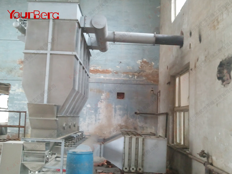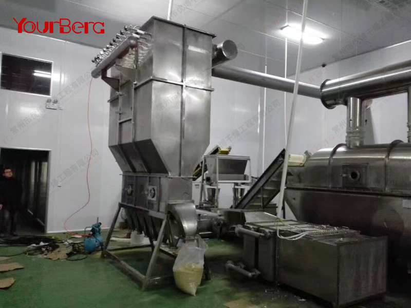散粒狀固體物料由加料器加入流化床干燥器中,過(guò)濾后的潔凈空氣加熱后由鼓風(fēng)機(jī)送入流化床底部經(jīng)分布板與固體物料接觸,形成流態(tài)化達(dá)到氣固的熱質(zhì)交換。物料干燥后由排料口排出,廢氣由沸騰床頂部排出經(jīng)旋風(fēng)除塵器組和布袋除塵器回收固體粉料后排空。蒸汽、電、熱風(fēng)爐均可配用(按用戶(hù)要求配套)。